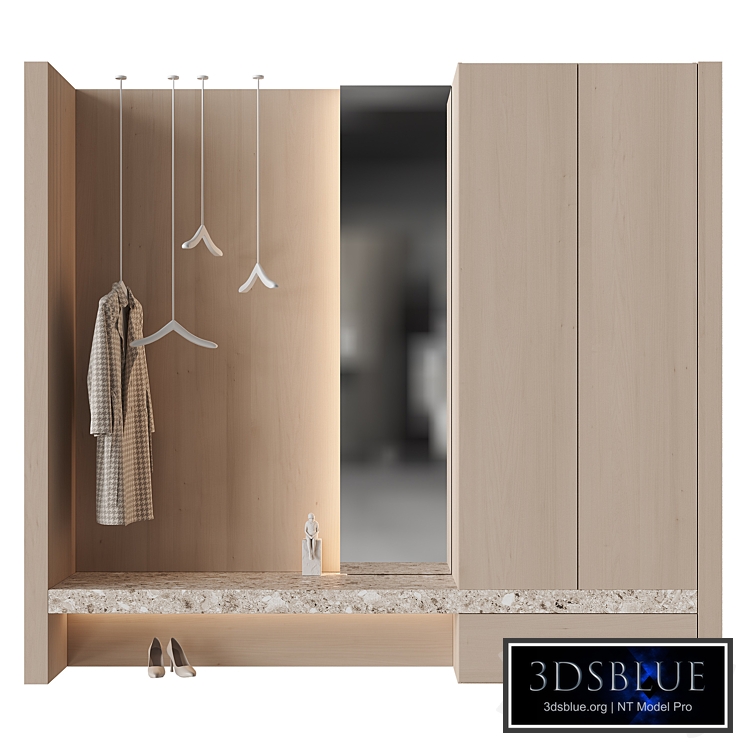 713 Hallway furniture with mirror NG02 Hangers, hidden box with electrical panel and NC) Overall dimensions 2910*60*260 cm Available in three colours, natural wood, beige and gray The set includes a trench coat on hangers, women's high-heeled shoes, a figurine, an electrical panel box (hidden), a mirror, money. Pivot of the door with mirror is configured for convenient opening In the archive: MAX2016(corona/vray) + OBJ + Texture + mtl 47405 polygons XForm, there is a scan. Pivot is configured. Turbosmooth is applied to the decor (in viewport - 0 iterations, in render - 1 iteration). In OBJ the stack is collapsed Modern, Scandinavian, minimalist, hidden cabinet, terrazzo