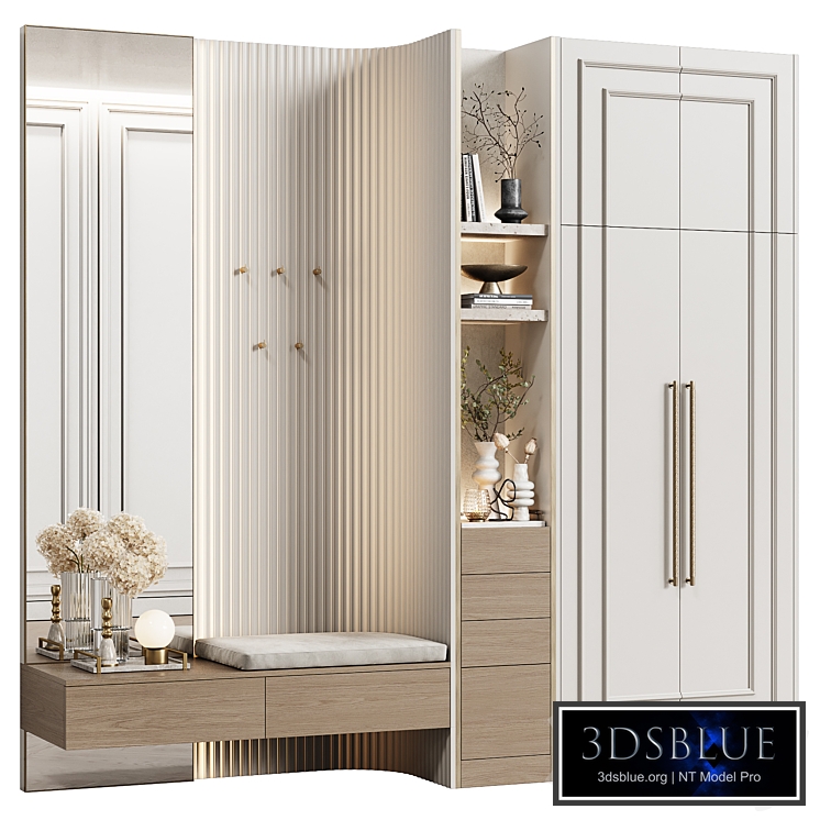 Hallway in Neoclassical style 41 (hooks, shoe rack, mirror) Description: CORONA Legacy Materials! 3d's max 2016 The scene has 4 color options, shown in the preview. Suitable for interiors: Scandinavian, modern classic, art deco, contemporary. Finishing materials: - milled ribbed relief panels; - mirror; - metal inserts - brass; - milled facades with panels. Can be easily edited if necessary. Custom-made cabinets. Metal overlay handles.