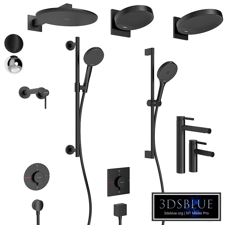 Hansgrohe Modern Bathroom Set - Black and Chrome A complete set of Hansgrohe sanitary accessories in two colors: matte black and chrome. Designed in a modern minimalist style, it is ideal for bathrooms in the loft, modern, and high-tech styles. The set includes: Overhead shower heads of various diameters Hand shower sets with wall holders Thermostatic shower mixers Single lever basin mixers Built-in thermostats and switches Peculiarities: Two finishes: matte black and chrome All models have correct proportions and corresponding real sizes One iteration of TurboSmooth was used in the rendering. Visualization done using Corona Renderer File formats: 3ds Max 2021, FBX Ideal for interior 3D visualizations and architectural projects with an emphasis on quality and realism.