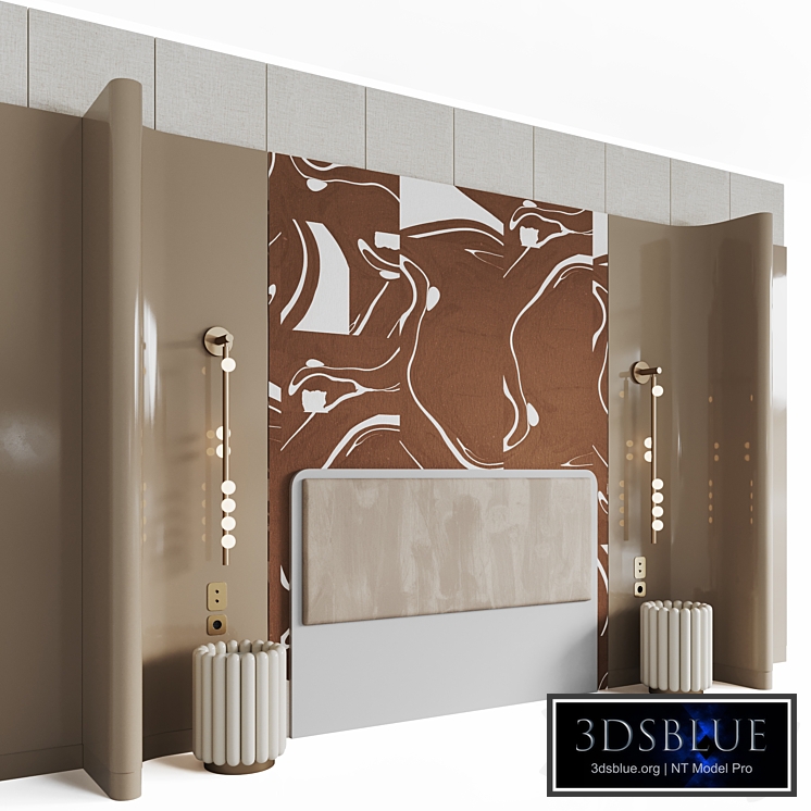 Headboard: - 3 wallpaper options: https://www.dropitmodern.com/collections/wallpaper/products/wallpaper-sediment-2-stone https://www.dropitmodern.com/products/wallpaper-famke-mural-terracotta-1 https://www.dropitmodern.com/collections/wallpaper/products/wallpaper-magma-rust-creme - soft wall panels - glossy wall panels, 800+700 mm wide - bedside tables, 370*370*480 mm (custom product) - padded panel upholstered in velor - wall lamp Drop System https://lindseyadelman.com/dss0701 - Solaris sockets and lever switches from Meljac https://www.meljac.com/en/collections/solaris-collection/ Reference: https://www.pinterest.ru/pin/2814818508835916/
