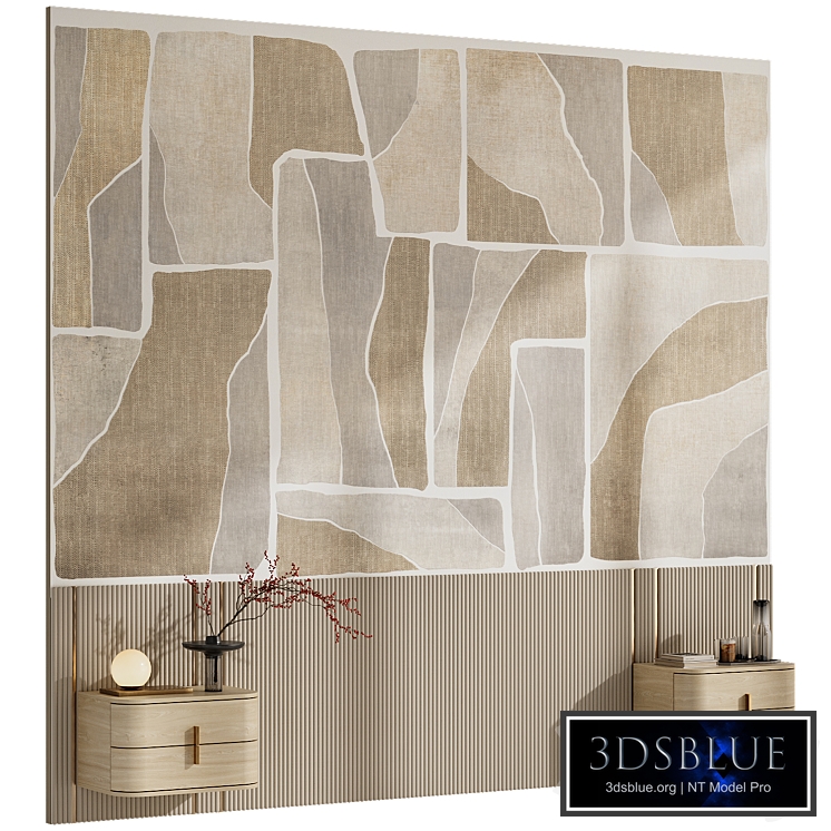 The headboard of the bed with frescoed panels, bedside tables, soft panels with brass inserts and decor. The scene with the model shows a wall with a fresco panel in 3 different versions. https://www.oboilux.ru/wallpapers/tecnografica/collection-2022/79278-3 On the decoration of the cabinets (except for the branch) there is a Turbosmooth modifier - open, adjust the degree of smoothing at your discretion. In the preview and in the scene, the Turbosmooth iteration = 1. Overall dimensions of the entire structure: length: 3390 mm width: 500 mm height: 3100 mm Overall dimensions of the bedside table: length: 600 mm width: 430 mm height: 360 mm The renderers are made in Corona Render 9. Corona Legacy Mtl. "For Corona Render: it is recommended to install a version not lower than 1.5, since the glossiness of the materials is configured with PBR in mind."