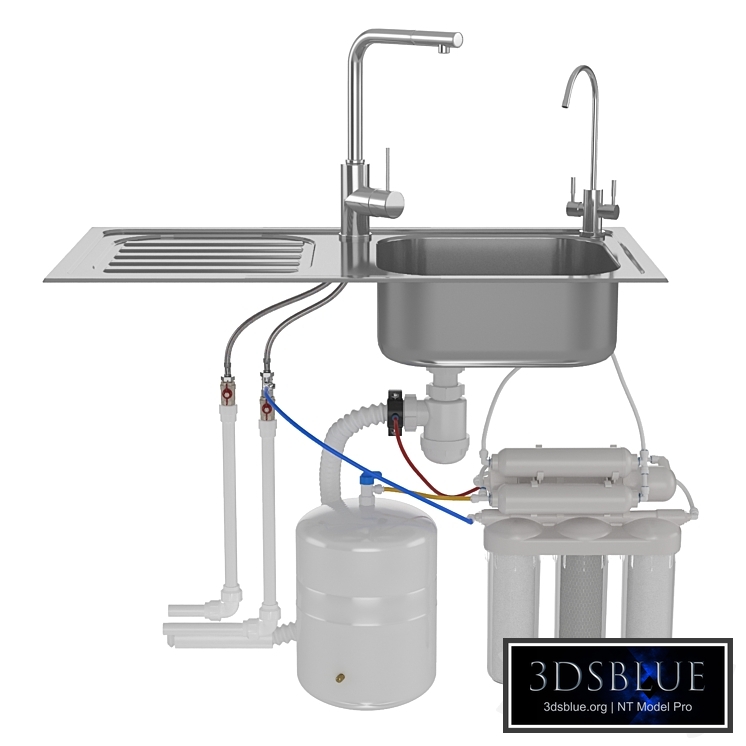 Domestic deep water filtration system based on reverse osmosis. Additionally, the main components associated with the installation (kitchen sink, taps, siphon, supply pipes), but not included in the package of the filter itself, are attached.