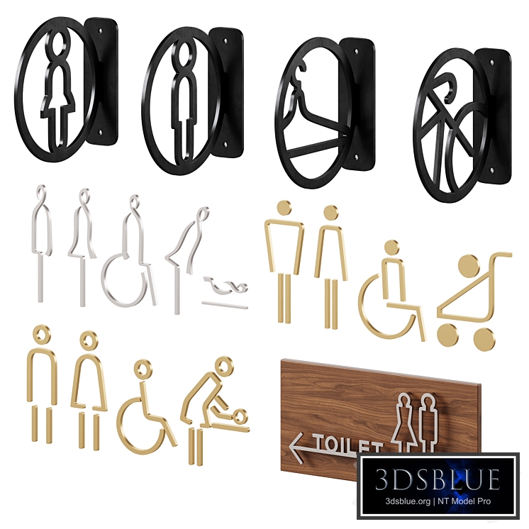 Bathroom door signs All signs can be found on the Etsy website Men and Women toilet / Disabled / Baby Changing / Bathroom Sign / Toilet Sign / Bicycle Sign / Locker room Sign Model properly sized in mm units Model has no hidden/frozen elements, no groups/linked objects No lights, cameras, helpers, layers, particle view All elements have 100/100/100 scale and correct normals No any modifiers in stack except of turbosmooth Elements properly named
