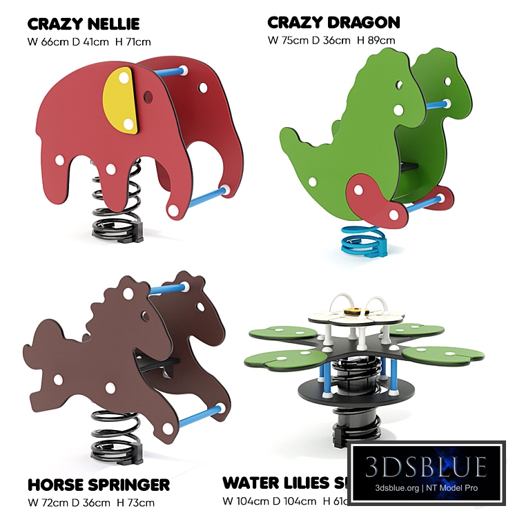 Set of springs for playgrounds Play house for playgrounds from the well-known Danish manufacturer Kompan: 1. M113 "CRAZY DRAGON" Link to the manufacturer's website: https://www.kompan.ru/igra/otdelnoe-igrovoe-oborudovanie/pruzhinnye-kachalki/veselyj-drakonchik 2. M123 "CRAZY NELLIE" Link to the manufacturer's website: https://www.kompan.ru/igra/otdelnoe-igrovoe-oborudovanie/pruzhinnye-kachalki/veselaya-nelli 3. M175 "WATER LILIES SPRINGER" Link to the manufacturer's website: https://www.kompan.ru/igra/otdelnoe-igrovoe-oborudovanie/pruzhinnye-kachalki/vodyanye-lilii 4. PCM105 "HORSE" (HORSE SPRINGER) Link to the manufacturer's website: https://www.kompan.ru/igra/otdelnoe-igrovoe-oborudovanie/pruzhinnye-kachalki/loshadka Faces: 70400 Verts: 79454 Vray: 4.20.00. Who works in V-Ray version lower than 3.1, be careful, in the materials in the BRDF section there is Microfaset GTR (GGX), if your version is older than 3.1, then the BRDF field will be empty. Choose Blinn, Phong or Ward - which is preferable for you. Corona 6.0. For Corona render, it is recommended to install at least version 1.5, as the glossiness of the materials is adjusted with PBR in mind. 3dsMax2016 + fbx, mat files and textures files included.