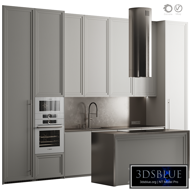 Kitchen with appliances and island Dimensions: height 3100 mm length 2550 mm The model is collected into a group, all objects are logically named. Enjoy using it and have beautiful renders! For all questions and wishes, welcome to PM)