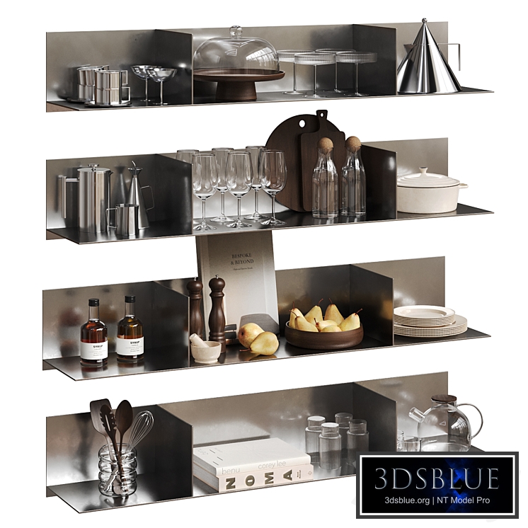 Decorative Set In Metal Shelves with kitchen utensils and tableware. - The Conico kettle; - Pears; - Dessert stand; - Chrome cups; - Wood boards; - Ribbed glasses; - Ceramic pan; - Syrup bottles; - Glass teapot; - Wine glasses; - Cookbooks; - Coffee press; - Spice grinder; Some objects have a Turbosmooth modifier enabled during render with 1-2 itinerations for smoothing the geometry. It can be adjusted at your discretion. 3Ds Max 2019 + OBJ Corona and V-Ray Polys: 282.684 Verts: 149.059