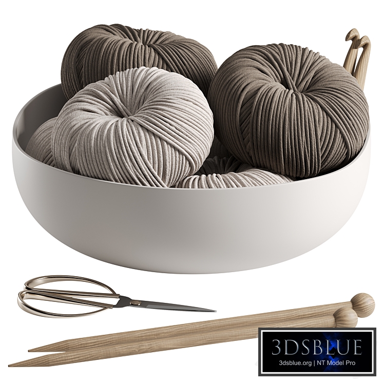 Decorative knitting kit • yarn for knitting • storage bowl • crochet hooks • knitting needles • small sewing scissors Units: mm Polys: 244,996 Verts: 122,638 The model is made for smoothing Turbosmooth enabled in Render Iteration mode - 2 In the archive: version 3dsmax 2016 (corona/vray) + FBX + matlib + maps Corona Version - CoronaLegacyMtl Materials V-Ray version - materials obtained with V-Ray-converter All objects, textures and materials have logical names #089