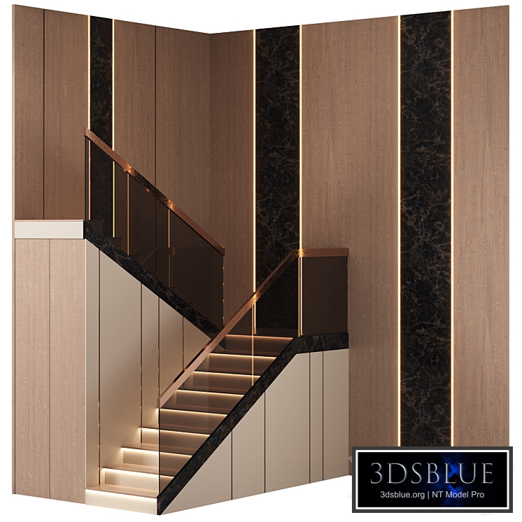 Modern style staircase made of wood with stone inserts height of the flight to the floor of the 2nd floor 2900 mm length 3200mm step height 180mm Render: Corona (9) Poly: 8008 Verts: 8196 CoronaLegacyMtl requires Corona Renderer version 1.5 or higher as the maps are designed to use PBR