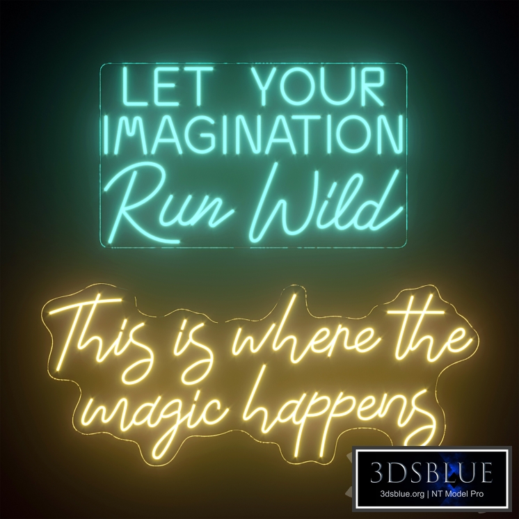 Light modules Set 244 Neon - Neon, sign, inscription, text, plate, Let Your Imagination Run Wild, This is where the magic happens, give free rein to your imagination, where magic happens - VRayLightMtl (CoronaLightMtl) is used as the LED glow - The power of the LEDs must be adapted to your scene, taking into account the light perception characteristics of the camera - File Formats: 3dsMax 2011 (Vray, Corona), FBX, OBJ - preview renderings were made in the crown - Polys: 34416 Verts: 34788 Neon set 1: https://3dsky.org/collection/shared/5205535 Neon set 2: https://3dsky.org/collection/shared/5081362 Neon set 3: https://3dsky.org/collection/shared/5081413