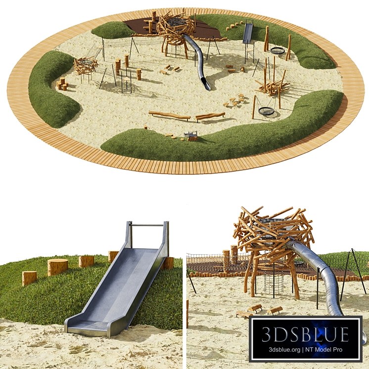 Log playground Contains content from various game complexes, swings, slides and other things. Terrain, sand, and grass are made using VRayDisplacementMod, for the sake of facilitating the scene. Dimensions: W:31.8 m. H:4.4 m. D:31.8 m. Polys:776 784 Verts:876664