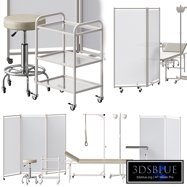 Medical equipment. Сorona 6, Vray 6. There are 8 objects in the file: a couch, a tripod for IVs, a pull-up stand, a treatment table, a manipulation table, a medical stool, double and triple screens. The screens are grouped: when ungrouped, you can open each door individually, and the pivot is configured. All colors can be changed to any color via Color. The total (Polys 44,706) without the Turbosmooth modifier is shown on the grid. The Turbosmooth modifier is used on objects to facilitate work in the viewport (0 iteration in viewport, 1 iteration in render). The scene is in MM! In OBJ stack without Turbosmooth a couch, an IV drip, a pull-up stand, a treatment table, a manipulation table, a medical stool, screens.