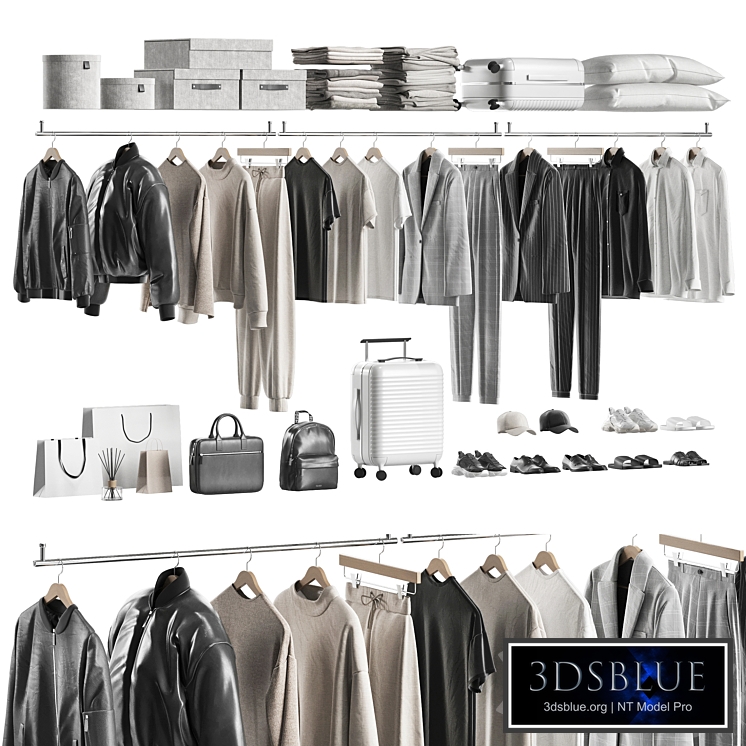 Other models with clothes: http://3dsky.org/collection/shared/5320613 The archive contains two 3dsMax 2018 scenes for Corona and V-Ray + fbx files. The renderers for the previews are made in Corona Render 9. On the Corona Legacy Mtl model. A version of Corona Render at least 1.5 is required. The conversion of materials to V-Ray is performed using the standard V-Ray scene converter. V-Ray version - 6.1 The Turbosmooth modifier is applied to several objects during rendering, disabled (geometry for smoothing). Adjust the degree of smoothing as needed. Poly: 827 829 Verts: 851 745 All my models are optimized, made for smoothing (where it is needed). They don't have unnecessary geometry or unnecessarily heavy maps. All archives are as light as possible without loss of quality. All objects and materials are logically named. The set for the wardrobe or store/showroom includes men's outerwear: a leather jacket and a windbreaker. Casual: sweatshirt, hoodie, sweatpants, T-shirts. Formal wear: two suits, jackets, trousers, shirts. Shoes: sneakers, men's shoes, slippers, loafers. Men's bag and backpack. Baseball cap. Folded sweaters, things in piles. Pillows. Storage boxes. Suitcases. Packages from a clothing store. "For Corona Render: it is recommended to install a version not lower than 1.5, since the glossiness of the materials is configured with PBR in mind. If you work in a V-Ray version lower than 3.1, be careful. In the materials in the BRDF section, there is a Microfaset GTR( GGX), if your version is older than 3.1, then the BRDF field will be empty. Choose Blinn, Phong or Ward, whichever is preferable for you."