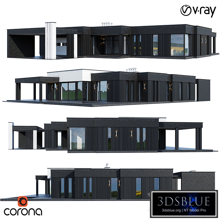 Model of the mansion - 21.93*29.04*5.50m - The model is made from one object - One multi-material with titles - All materials are configured - Suitable for various angles - In the archive models for V-ray and Corona - 3DsMax 2015/Fbx - Poly: 16449 - Vert: 20756 - Those who work in V-Ray version lower than 3.1, be careful, in the materials in the BRDF section there is Microfaset GTR (GGX), if your version is older than 3.1, then the BRDF field will be empty. Select Blinn, Phong or Ward - what is preferable for you - For Corona render, it is recommended to install version no lower than 1.5, since the glossiness of materials is configured taking into account PBR