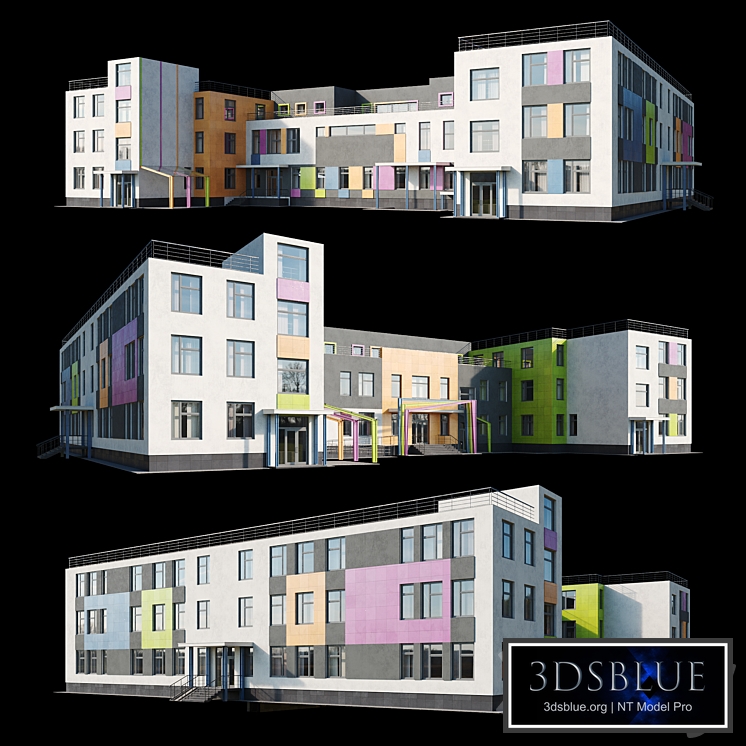 A high-quality visualization model of a public building of a modern kindergarten/school with a small footprint for ease of location on the terrain. The model is assembled as detailed as possible and accurately in real size without the help of any plug-ins. The windows have randomized curtains made with high-quality textures with an Opacity map. Mapping stacks are not collapsed, which will allow you to conveniently edit if necessary. The internal walls of the building are made conditionally without reference to the actual dimensions of the premises. The colors of the facade materials can be changed without problems. For the convenience of working on all objects, there are different Material IDs and, accordingly, one Multi / Sub Object material. In the archive version for Vray and Corona, plus an .obj file and high-quality textures. Polys: 76823 Verts: 82475