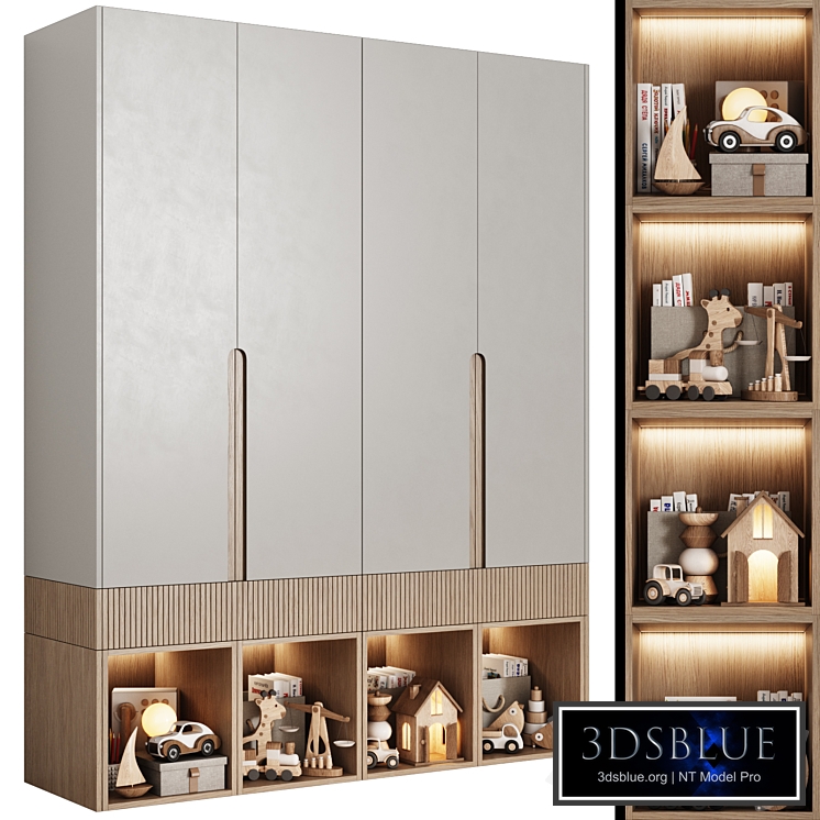 Modular children's wardrobe in a modern minimalist style 09 Description: CORONA and V-RAY materials! (vray materials were obtained by converting corona materials without modification!). There are 3 cabinet color options in the scene. Fronts with an integrated arched handle. Drawer fronts with milling. At the bottom of the cabinet there is an open shelving unit with decor. The cabinet consists of two separate modules and is easy to edit. Custom made cabinets. The scene contains all the decor (wooden toys, books) that is in the preview.