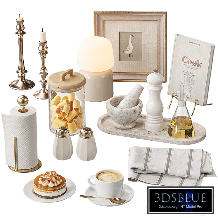 1168 Zara Home Kitchen Decor NG10 Overall dimensions of the set 80*65*30 See Items and decor for the kitchen, dining room, shelves, storeroom, veranda, cafe In the archive: MAX2016(corona/vray) + OBJ + Texture + mtl 43907 polygons XForm, there is a scan. The pivot is configured. Turbosmooth is loaded (0 iterations in viewport, 1 iteration in render). The OBJ stack contains a roll of paper towels, a holder, a glass jar with pasta, a lid, matches, boxes, a kitchen towel, folded, an oval tray, a bowl with a mortar, a mechanical pepper pot, a table lamp, a night light, classic silver candlesticks, a picture frame, a goose, a book stand, a recipe book, a cup with coffee, cappuccino, plate with Tiramisu, cake, cake, bottle with spout, olive oil, Zara Home, ZH, Zara Home, small things for kitchen, table, decor, filling, countertop decor