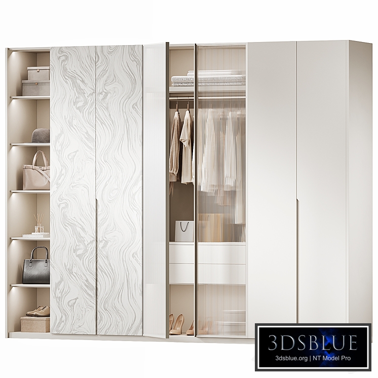 A contemporary wardrobe with combined fronts: matte panels with an abstract fluid pattern and hinged doors made of ribbed glass. 327.5 x 60 x 260 cm - Backlighting in instance mode and combined into a separate group. - The glass door pivot points are aligned with the hinge axes for easy opening. polys: 428 161 verts: 432 437 Contents: wardrobe, closet, clothes, women's clothing, shirt, dress, blouse, casual wear, bag, diffuser, pattern, bags, storage boxes, shoes, shoes, women's shoes, boots, heels, classic shoes, folded clothes, hanger, hangers, glass doors, fluted glass, fluted, lighting, wardrobe system, storage system