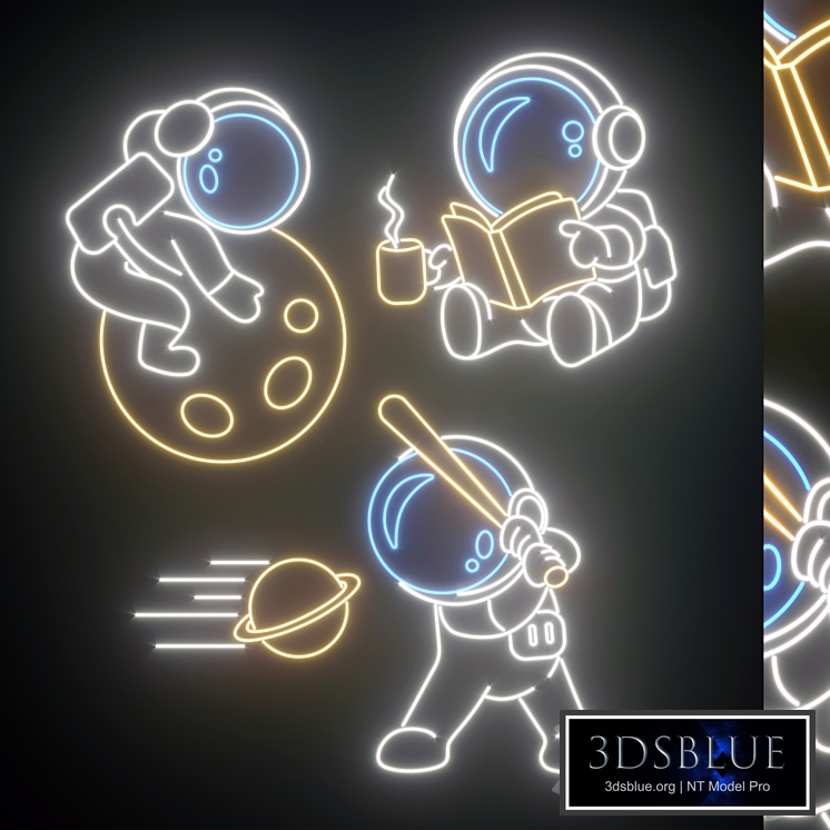 Neon 276 - Neon, children's room, astronaut, space, spacesuit, astronaut in the nursery, bat, baseball, planet, moon, book, wall decor in a bookstore or cafe - VRayLightMtl (CoronaLightMtl) is used as the LED glow - The power of the LEDs must be adapted to your scene, taking into account the light perception characteristics of the camera - File Formats: 3dsMax 2011 (Vray, Corona), FBX, OBJ - Render preview - Corona 1.6 (For Corona render, it is recommended to install version no lower than 1.5, since the glossiness of the materials is adjusted taking into account PBR) - Polys: 48360 Verts: 48089 Neon set 3: https://3dsky.org/collection/shared/5205535 Neon set 2: https://3dsky.org/collection/shared/5081362 Neon set 1: https://3dsky.org/collection/shared/5081413
