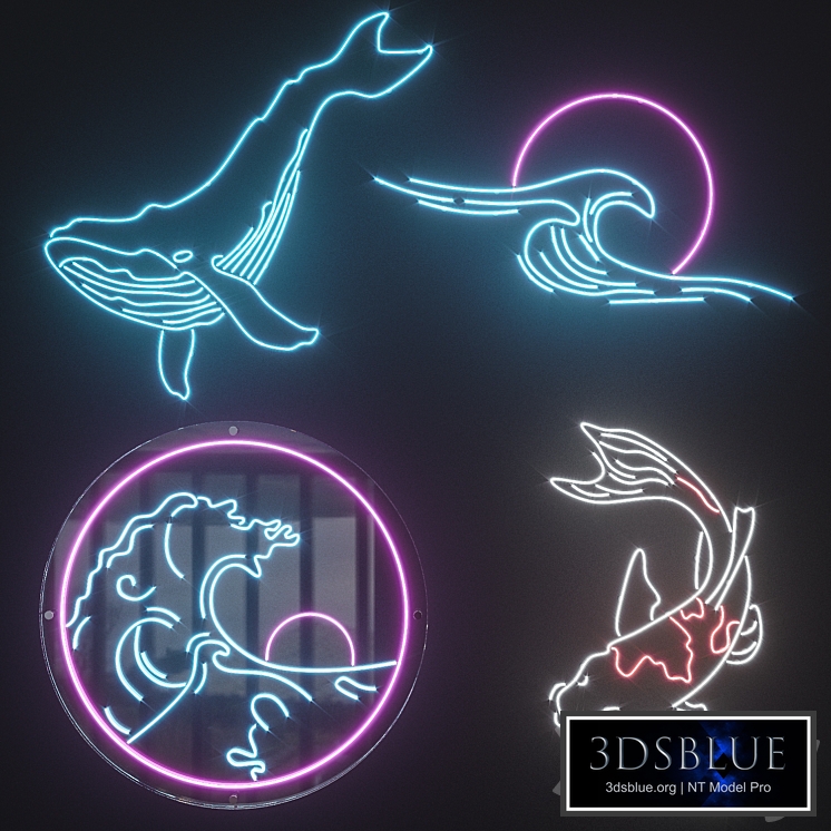 Neon sign, neon decor for clubs, bars, cafes and loft-style interiors. Diameter of a round signboard with a wave 90 cm Height and width of the sign "whale" 90cm CoronaLightMtl is used as the glow of neon tubes. The power of the LEDs must be adapted to your scene, taking into account the light perception of the camera. Bloom and glare activation is required for full effect. Render: Corona Formats: 3Ds Max 2016, FBX, OBJ.