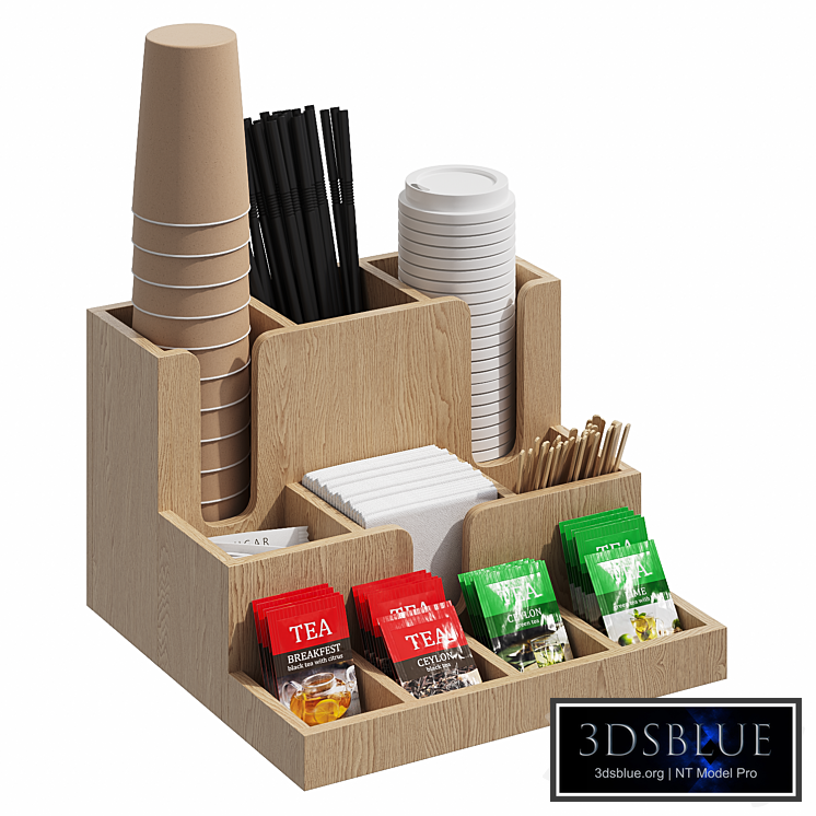 Organizer for disposable tableware and tea accessories. The set includes a wooden organizer, paper cups, lids, napkins, straws, stirring sticks. 4 types of tea, sugar. In the archive: 3ds max 2019 Render: Corona (8), CoronaLegacyMtl, obj, fbx.