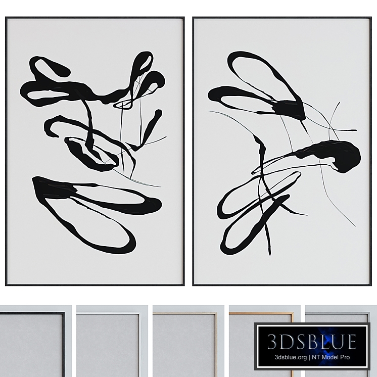 A set of 2 photo frames without a passe-partout with glass and a thin frame in a modern style, with minimalist images in the form of lines and strokes. The file contains 5 frame materials (black enamel, white enamel, gray enamel, gold, wood). Frame sizes 75*50. Polys 1844 Verts 1712 To change the frame color, you need to assign the appropriate Polygon ID (1 - black, 2 - white, 3 - gray, 4 - gold, 5 - wood).