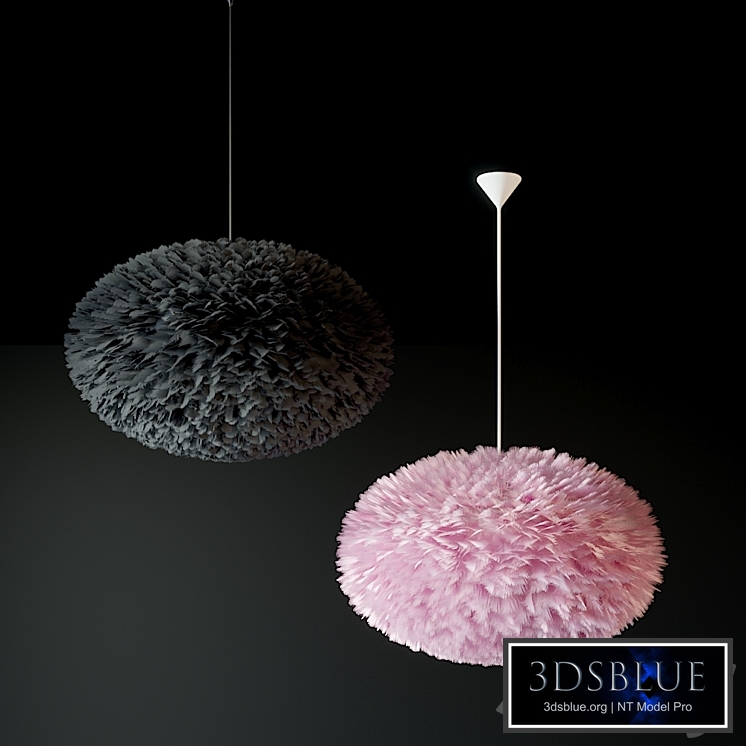 Pendant luminaire made of Eos feathers on white wire L Eos Hanging Lamp With White Cord 2 chandeliers in black and pink. Lampshade height: 40 cm Shade diameter: 65 cm Material: quill pen, paper, acrylic, textile Archived 2 chandeliers, 2013 Max and OBJ corona renderer