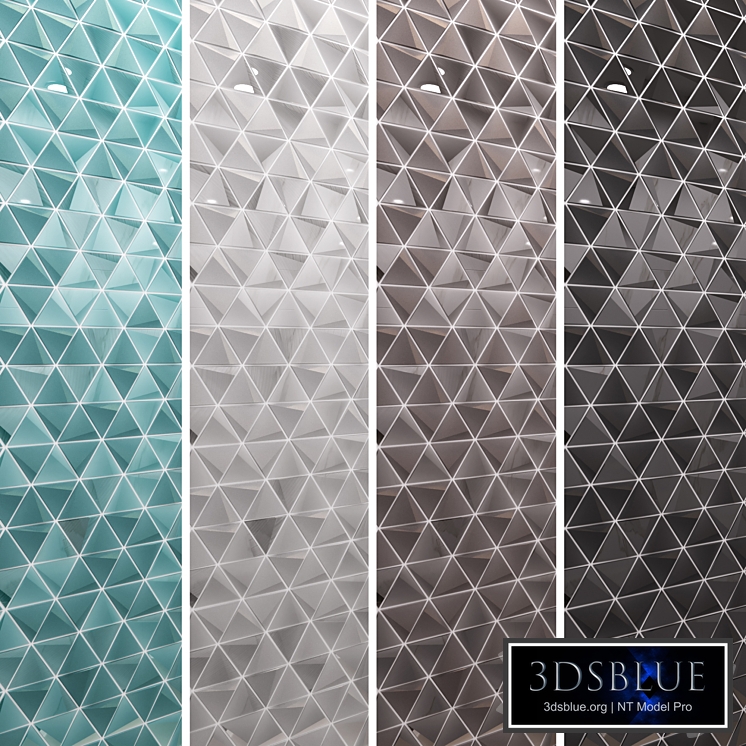 Glass mosaic tile PORCELANOSA EFFECT TRIANGLE The model is presented in four colors: emerald, silver, caramel, black. The modifier stack contains Material by element. Link to the manufacturer's website: https://www.anticcolonial.com/producto/effect-triangle-emerald-31x26x08/