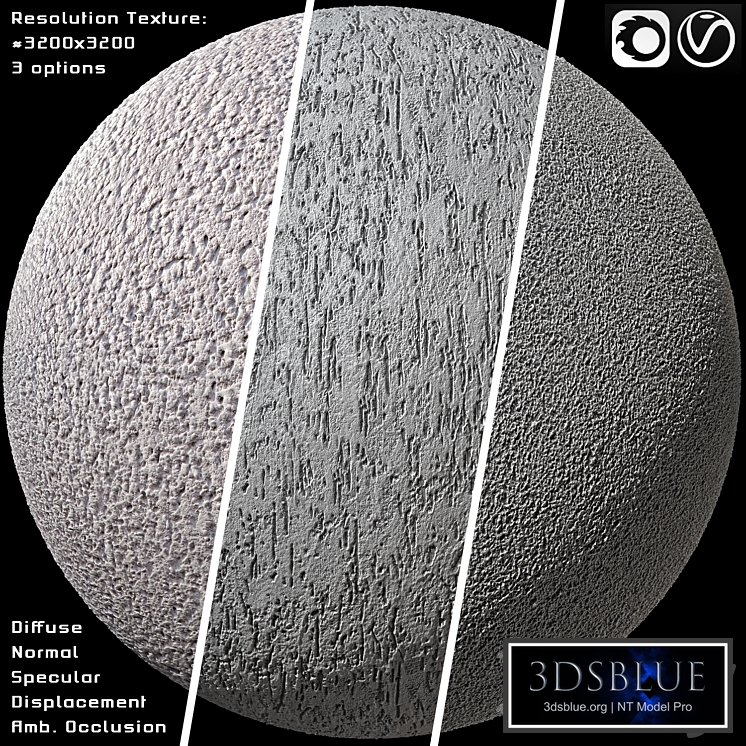 Relief figured ribbed decorative facing concrete plaster Reckli ==================== 3 options for plaster material. Seamless texture ==================== Resolution Texture (PNG): ≈3200x3200 ==================== Reckli / Roughcast: Lahn Marne Parana ==================== Textures: -Diffuse, -Normal, -Specular, -Displacement, -Ambient Occlusion. ==================== Format: -3ds max 2012 (V-ray), -3ds max 2012 (Corona), -3ds max 2015 (V-ray), -3ds max 2015 (Corona), -Fbx (V-ray), -Fbx (Corona). ================== Render: V-ray & Corona ================== All files are archived. ================== Functional use: decorative plaster, facade finishing, bark beetle plaster, wall decor, wall material, concrete finishing, cement texture, rough uneven wavy surface, imitation of wild stone coating, relief, cobblestone, slate, rock, rubble masonry, gypsum, putty, brick, concrete, can be used as decor: headboard, slats, stripes, ribs, waves, facing of house coverings: basement, wall, stairs,