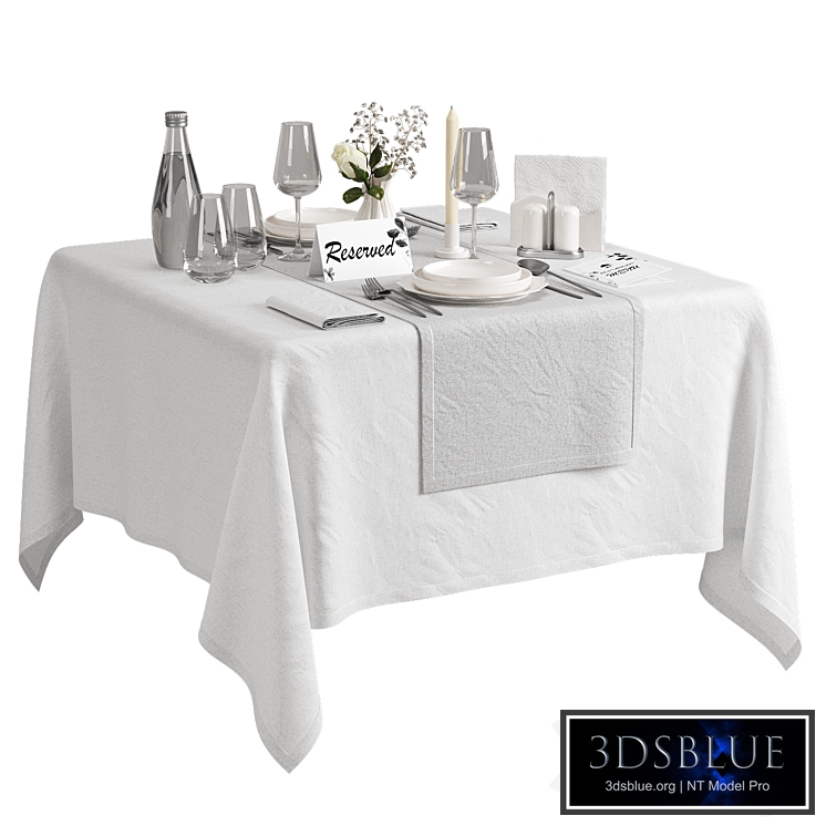 Restaurant table setting with tablecloth. Tablecloth for a square table measuring 800*800mm The model is suitable for decorating cafes and restaurants (dishes, bottle of water, vase, cutlery, napkins, tablecloth, candle, glasses, menu, reservation sign) Render: Corona (9) Polys: 155350 Verts: 131612 The model uses materials from CoronaLegacyMt CoronaLegacyMtl requires Corona Renderer version 1.5 or higher