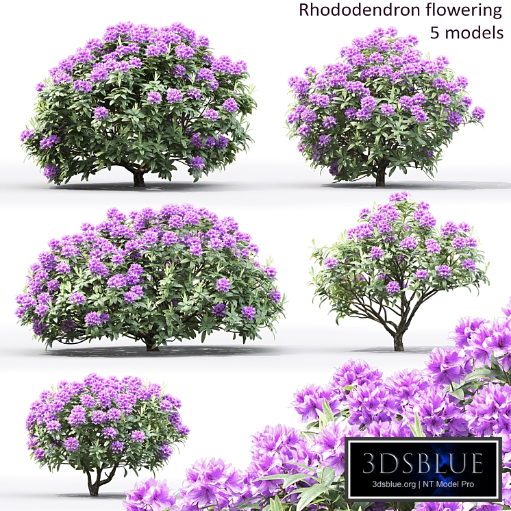 In the scene there are 5 rhododendron bushes during the flowering period. Bushes height: 1.1 m - 1.5 m Polygons: 1 142 692 Petals and leaves using opacity map The branch material uses vertex color These bushes with a different color of the inflorescences: https://3dsky.org/3dmodels/show/rhododendron_1_1 Enjoy your use!