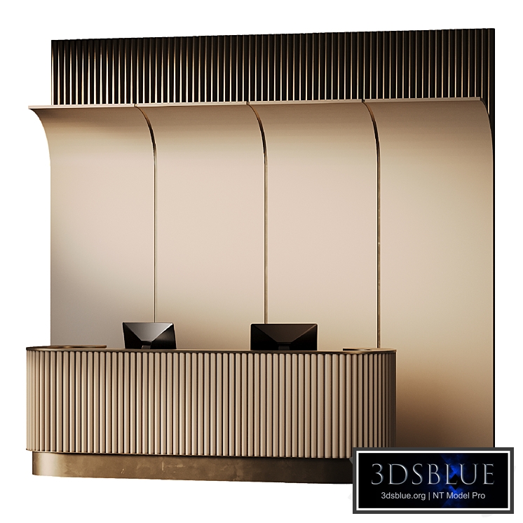 A modern reception desk with a distinctive rhythm of vertical slats. The facade is finished in warm bronze-beige tones with a rounded shape and a soft sheen. The rear wall is finished with large panels with smooth curved elements and a decorative top slat, creating a sense of height and lightness. Ideal for modern offices, business centers, and premium hotels.