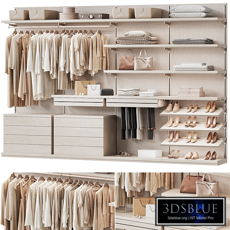 Rimadesio Dress Bold wardrobe system with women's clothing and shoes. Each module is represented as a separate object for easy editing and combination. The backlight is in instance mode and combined into a separate group. 400 x 60 x 270 cm polys: 1,114,319 verts: 1,127,078 Contents: dressing room, wardrobe, closet, storage system, modular closet, Rimadesio, Dress Bold, light furniture, minimalism, women's clothing, women's shoes, dress, blouse, skirt, trousers, cardigan, jacket, sweater, shoes, sandals, accessories, bag, women's bag, clutch, baskets, boxes, drawers, shelves, pillows, textiles, hanger, hangers, shoe racks, storage, minimalism, modern style, organization, modular system, LED lighting, walk-in closet, modern wardrobe, wardrobe, closet, storage system, modular wardrobe