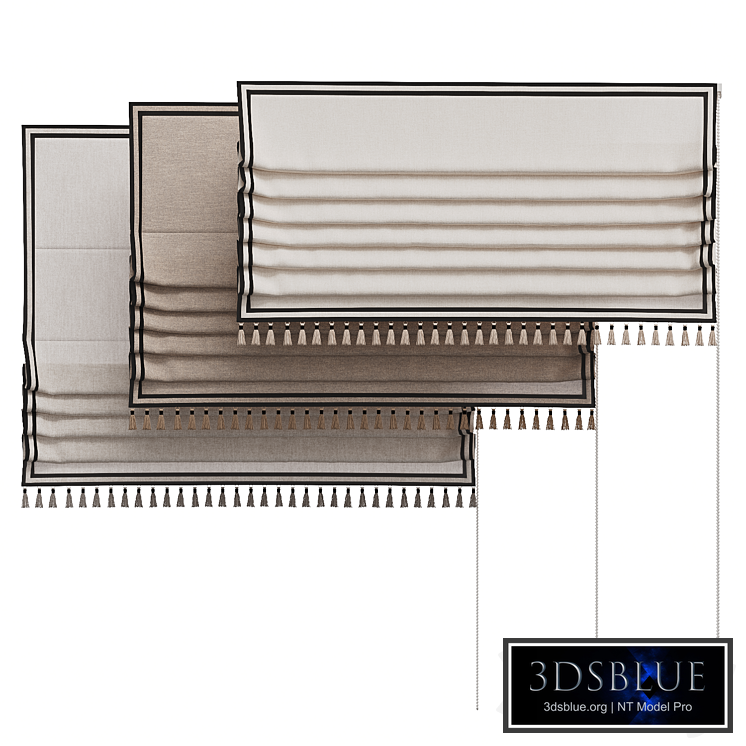 Roman blinds 3 colors with piping and tassels Curtain width - 100 cm, height in three versions - 60 cm, 75 cm, 90 cm. In the archive: 3ds max 2019 Render: Corona (8), CoronaLegacyMtl, obj, fbx.