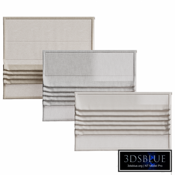 Roman blinds made of linen in grey, beige and milky colours. Curtain width - 100 cm, height in three versions - 60 cm, 75 cm, 90 cm. In the archive: 3ds max 2019 Render: Corona (8), CoronaLegacyMtl, obj, fbx.