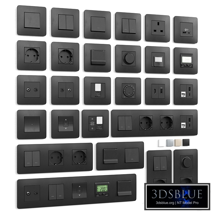 Schneider New Unica Studio series Wall light switches and sockets * Parts are not attached to frames so configuration can be changed easily Objects: 1 pole Light switch 2 pole light switch Schuko standard power socket HDMI TV socket Satellite socket USB C charger USB A charger British (UK) power socket Roller blind push button Dimmer Rotary thermostat Digital thermostat Schuko power socket with cover Telephone socket Data socket Motion sensor 3 shutter control