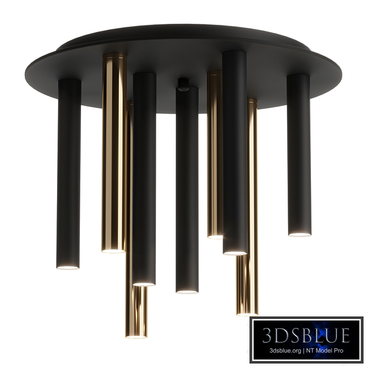 Round LED ceiling lamp with 9 lamps made of metal with a shiny gold finish and a matte black finish. Round LED ceiling lamp with 9 lamps made of chrome-plated metal and a white matte finish.