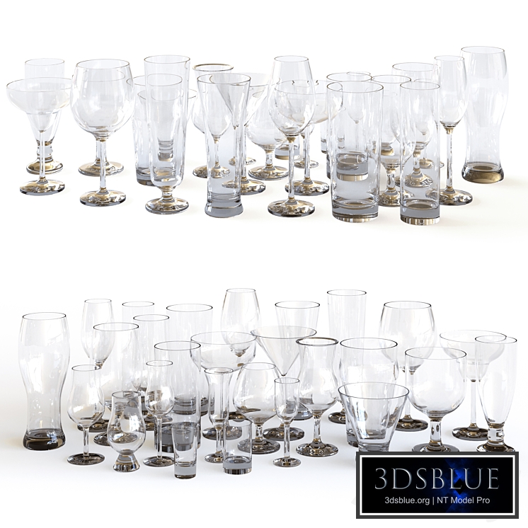 Set of 27 glass goblets. All objects and materials have logical names. The model is made for anti-aliasing. Objects are grouped and have an open TurboSmooth modifier