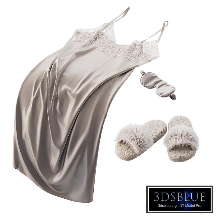Materials used in the model: CoronaLegacyMtl - requires CoronaRender version at least 1.5 A set of home clothes for sleep. Set contents: silk lace chemise (nightie), sleep mask, fluffy fur slippers. The nightie was created in a simulation of lying on a bed At a close angle, the TurboSmooth modifier must be active on the shirt Model without the Hair And Fur modifier. Fur on slippers - geometry