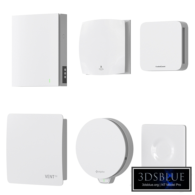 A set of internal (intra-apartment / intra-house) recuperator units. The scene contains the following models of recuperators: Aspira ASPIRVELO AP Overall dimensions of the model: Height - 180mm Width - 180mm Depth - 48mm Aspira ASPIRVELO 2.0 SMART WI-FI Overall dimensions of the model: Height - 250mm Width - 260mm Depth - 50mm Royal Clima FIATO RCF-70 Overall dimensions of the model: Height - 206mm Width - 206mm Depth - 50mm Winzel Expert WiFi RW1-50 P Overall dimensions of the model: Height - 280mm Width - 230mm Depth - 65mm VENTini HRV-60-PLUS Overall dimensions of the model: Height - 280mm Width - 280mm Depth - 60mm AWENTA HRV100P Overall dimensions of the model: Height - 190mm Width - 190mm Depth - 20mm The archive contains a 3ds max 2017 scene for Corona + obj and mtl files. Renders for the preview were made in Corona Render 8. The model uses Corona Legacy Mtl materials. In the stack, the Turbosmooth modifier during rendering is 2 iterations (geometry for smoothing). Adjust the degree of smoothing as needed. https://www.vseinstrumenti.ru/category/rekuperatory-13218/