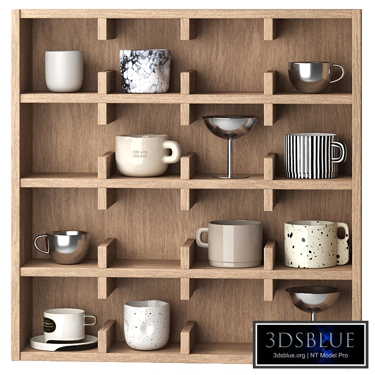Wooden wall shelf with mugs, cups and bowls. In the archive: Max2021(Vray) + fbx ; Max2021(Corona) + fbx; textures. All objects except the shelf will be given TurboSmooth during rendering. For Corona render, it is recommended to install version not lower than 1.5. Materials in Corona - Corona Legacy Mtl.