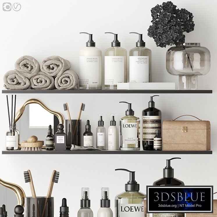 Cosmetics and decorative items for the bathroom on the shelves Polygons: 402059 Vertices: 423957 In the archive: max 2012 V-ray max 2012 Corona fbx V-ray obj textures