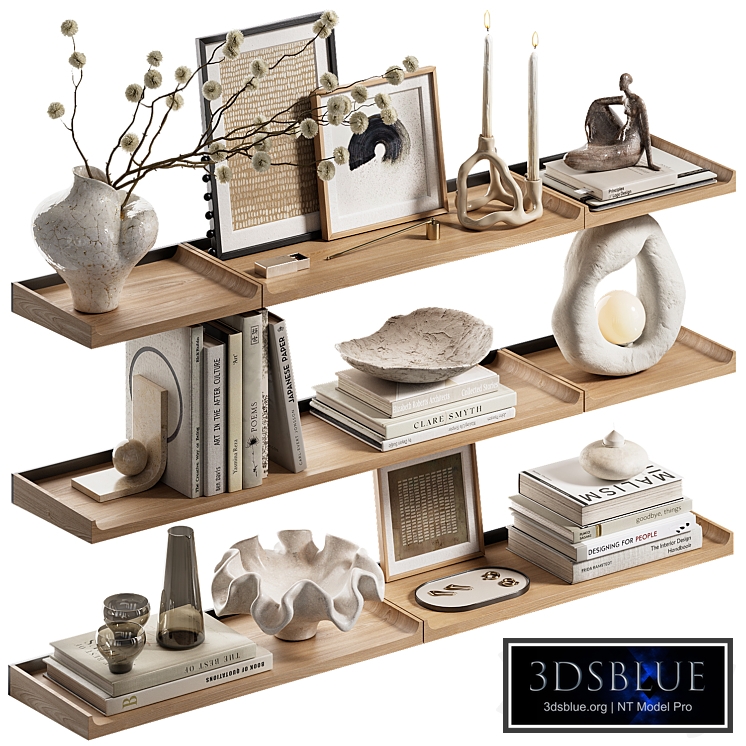 Shelves with decor. The set includes shelves of "NOTES" by Julienrenaultobjects https://leibal.com/products/notes/ Anti-aliasing modeling: the Turbosmooth modifier is open on the model elements (except for a vase with a branch and flowers, a lamp), adjust the degree of anti-aliasing at your discretion. In the preview, Turbosmooth iteration = 1. Designed for close angles. The renderers are made in Corona Render 9. Corona Legacy Mtl. "For Corona Render: it is recommended to install a version not lower than 1.5, since the glossiness of the materials is configured with PBR in mind."