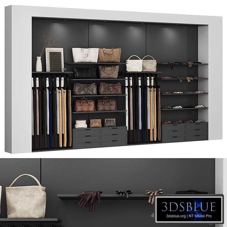 Display case with belts, bags and gloves. If you need to reduce the weight of the model, I recommend removing the stitching on the belts and bags. For close angles, you need to add a TurboSmooth modifier Render: Corona (9) CoronaLegacyMtl materials may not display correctly in very old engine versions