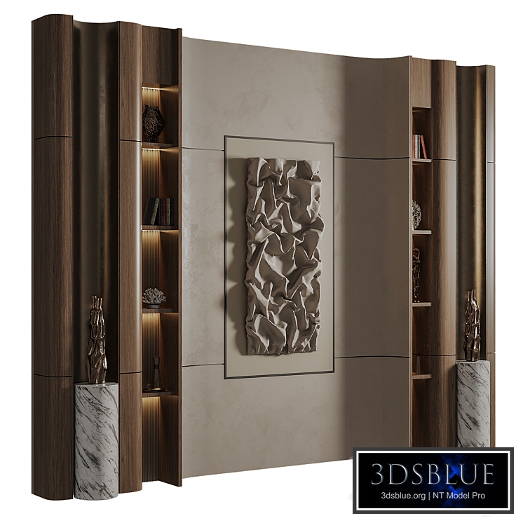 A decorative wall panel with soft, undulating geometry and a sculptural central relief. The combination of curved surfaces, warm wood, and integrated lighting creates depth and a calm architectural rhythm. Ideal for living rooms, hallways, and modern, premium interiors.