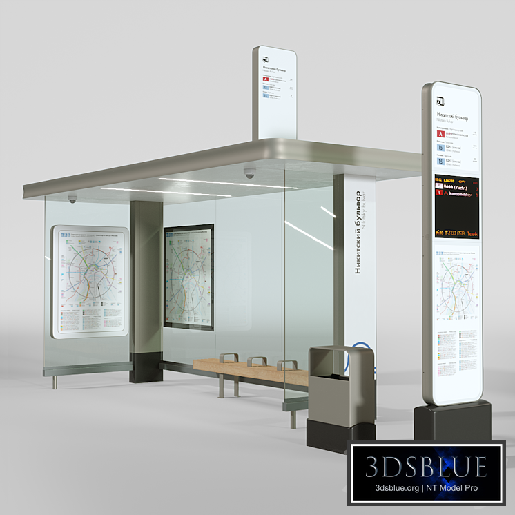 The model of public transport stop under the brand “Moscow Transport” is equipped with a navigation system, usb ports for charging gadgets, video surveillance cameras and a bench with special handrails to prevent sleeping on it. The ballot box and the information board are made in the general style in accordance with the original samples. Textures are made at the stop "Nikitsky Boulevard", but in the archive there are source codes in the psd format and the necessary fonts for editing. Black plastic material is made using Corona AO (for interaction with the base) adjusted in millimeters, this should be taken into account when importing into scenes with other units of measurement. The names of the objects are unique, the pivot point along the Z axis is reset to 0. There are three groups in the file. Polys: 115,000 Verts: 63,000 For Corona render, it is recommended to install a version not lower than 1.5, since the glossiness of materials is adjusted to PBR Successful renders, friends.