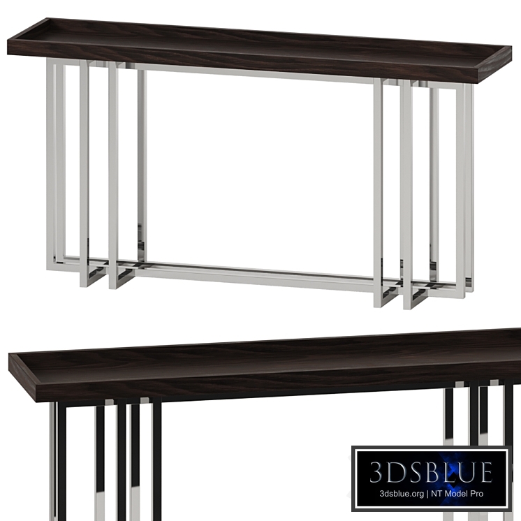 Vector is a console with top table in dark oak wood veneer, base in polished stainless steel and polished brass. The Vector collection was inspired by the architectural lines of the Getafe Market Cultural Center. This contemporary building served as the foundation for the creation of the Vector collection that exhales glamor and elegance through his lines. W 1600 x D 400 x H 800 mm