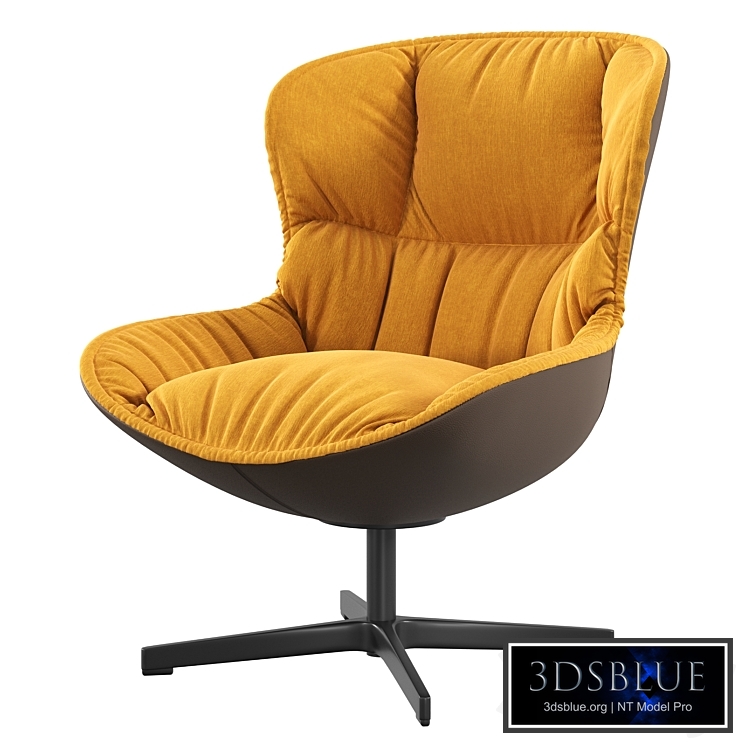 Swivel armchair Softy with combined fabric and leather upholstery. The steel frame of the chair is covered with extruded foam, the back and seat cushions are non-deformable polyurethane. Cushion padding with real goose down and polyester fiber filling. Backrest decor - horizontal and vertical stitching. The metal base and outer leather upholstery express the vintage soul of the Softy armchair and create a pleasant contrast to the generous and soft seat upholstery. Ideal for creating a modern and emotional environment such as lounges, waiting rooms, cozy hotel lobbies.