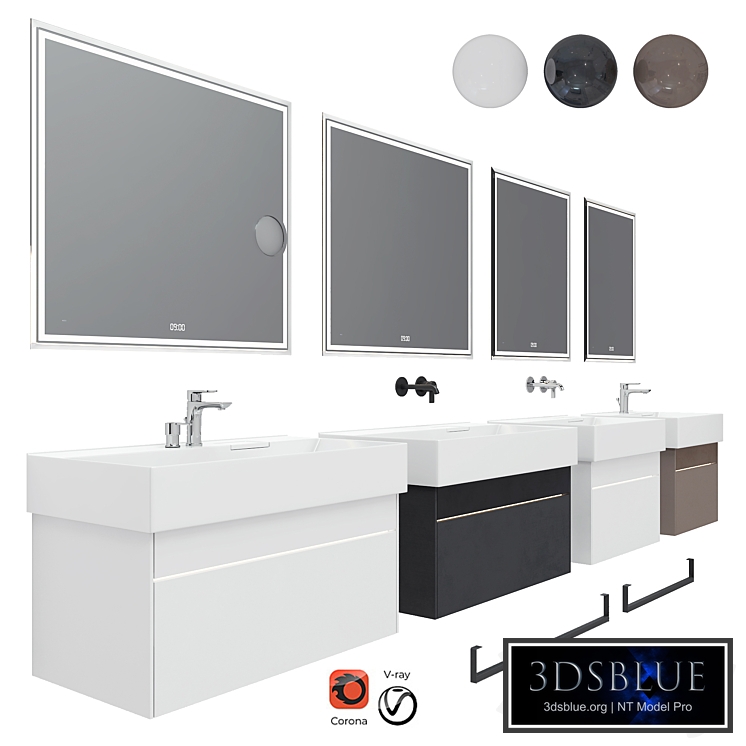 Formats: 3Ds Max 2014, FBX, OBJ All models are signed - under the articles! The Tecnologica collection will completely change your idea of what a bathroom can be. These are not just the technologies of tomorrow: they are new sensations from the most familiar things, day after day. With the new Tecno mirrors, as well as sinks, furniture and Logica accessories, the bathroom becomes more comfortable — and more exciting! Here, each item invites you to a pleasant game and is ready to give vivid emotions. Tecno smart mirrors reflect the technical innovations of the collection: The movement of the hand sequentially turns on, adjusts the glow (cold, warm, neutral) and turns off the backlight A mirror option with a cosmetic lens is available "Display" function with time display "Anti-fogging" function Lighting around the perimeter, for better visibility and interior illumination Transparent glass frame with satin effect Stylish Logica sinks with a roomy bowl and a hidden drain: • Clean and modern design • The invisible drain of Beauty Drain is shifted to the back wall. Thanks to this, the sink is easier to wash, and the storage space in the top drawer of the cabinet is increased • The overflow hole is hidden in a small box. It is closed with a ceramic lid with a side: it can be used as a shelf for soap • The collection has a sink with a built-in dispenser for liquid soap or hand cream Logica sink cabinets with two drawers: • Opening using Push-to-Open technology • The backlight turns on when approaching the bedside table • Lighting of the upper and lower drawer when opening • Top drawer for small things with a glass bottom and a glossy facade • Spacious bottom drawer with a matte facade https://kerama-marazzi.com/en/search/?q=Tecnologica&page=1&type=collections To change the color of the pedestal model, after ungrouping, select a sphere with the desired color in the scene with a pipette from the Material Editor and assign it to the model via the Assign Material to Selection scroll. "Who works in a V-Ray version lower than 3.1 be careful, in the materials in the BRDF section there is a Microfaset GTR ( GGX), if your version is older than 3.1, then the BRDF field will be empty. Choose Blinn, Phong or Ward – which is preferable for you" "For Corona render, it is recommended to install a version not lower than 1.5, since the glossiness of materials is configured with PBR in mind."