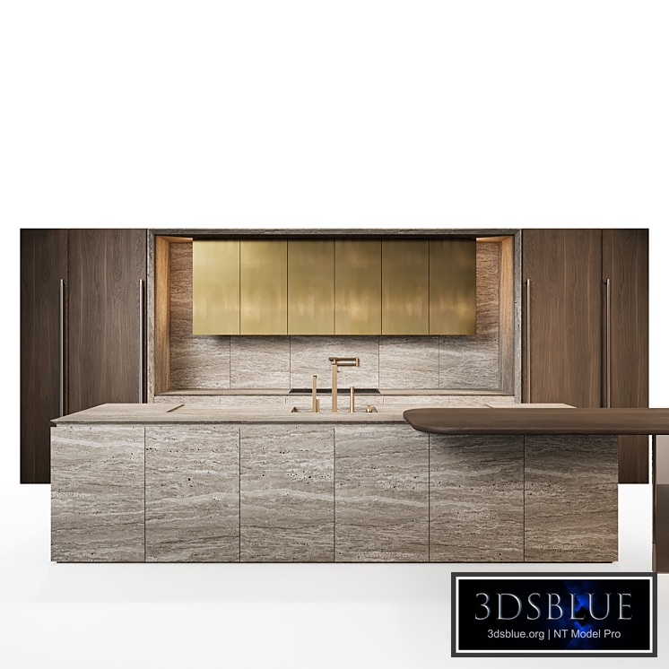 Reve kitchen unit designed by TEYO. Stone - Travertine. Metal - Burnished brass. Wood - Natural oak. Tap - Gessi. Induction cooktop - Gaggenau. Corona version 9 https://www.weareteyo.com/#collection-kitchens-13
