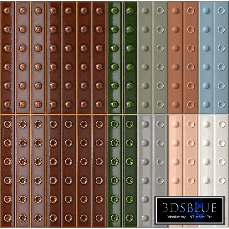MUTINA Punto tiles by Ronan & Erwan Bouroullec https://www.mutina.it/en/collection/punto-by-ronan-erwan-bouroullec 2 forms: UP and DOWN 5 matte colors: White, Grey, Red, Blue, Green 3 glossy colors: Blanc, Gris, Rose 2 glazed colors: Vert and Brun The grout can be of any color, which allows the tile to look monolithic, without obvious separation of elements. The material is made entirely from procedural maps. After compiling the necessary pattern/canvas/tile array, it is necessary to combine all the elements into one Editable Poly for the procedural maps to work correctly. The color of tiles and grout is easy to change. Materials have logical names. The model is made for anti-aliasing. A Turbosmooth modifier has been applied with one iteration, which is only visible on the render. The wide range of colors and materials and the convenient modularity of Punto tiles make them suitable for use as a geometric accent or as a neutral wall-filling backdrop in bathrooms, kitchens, living rooms and any contemporary space. It can also be used as a kitchen apron, as well as a headboard or a decorative panel.